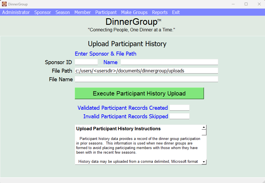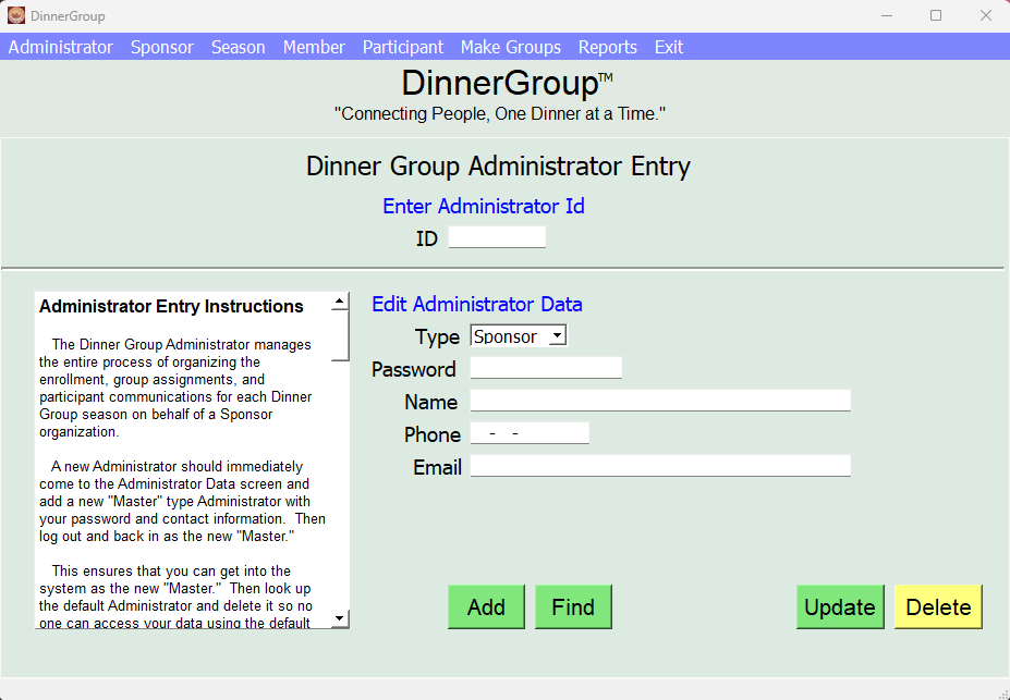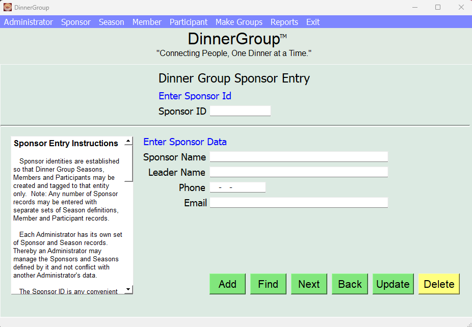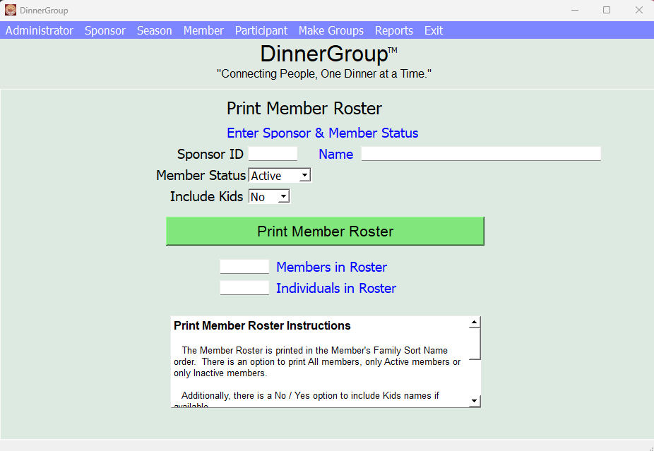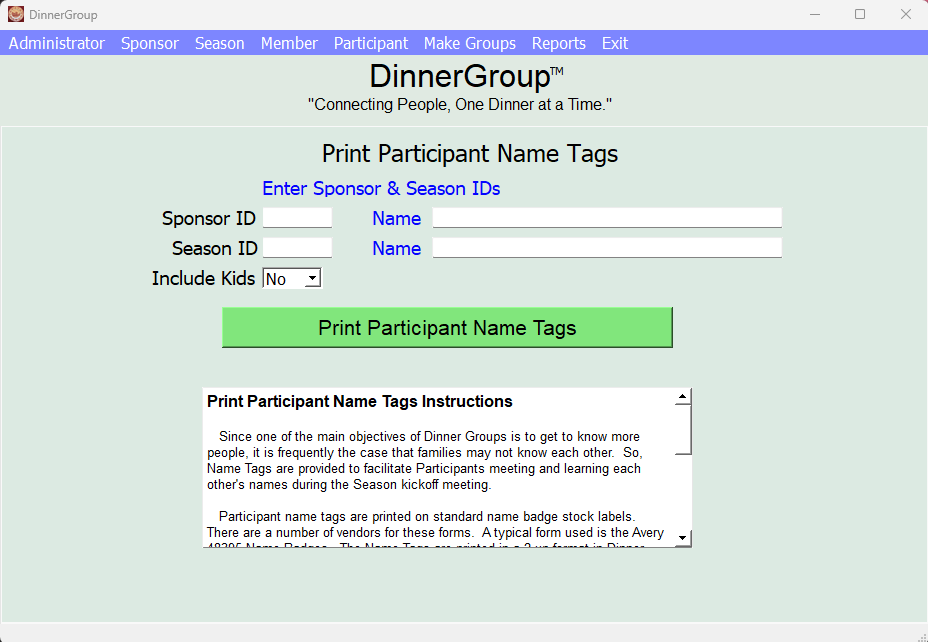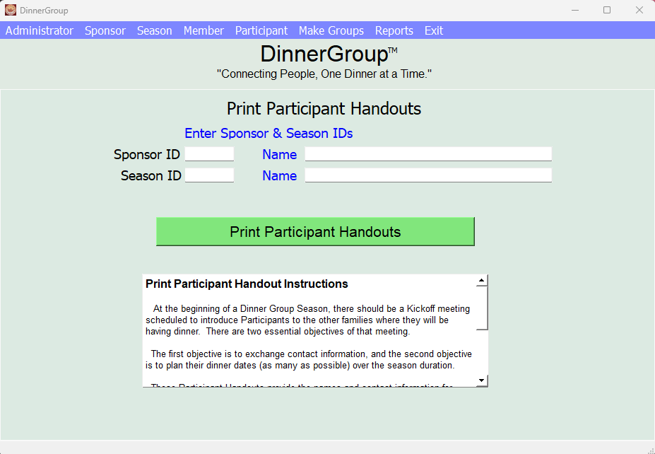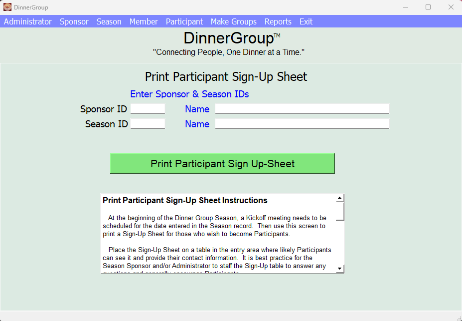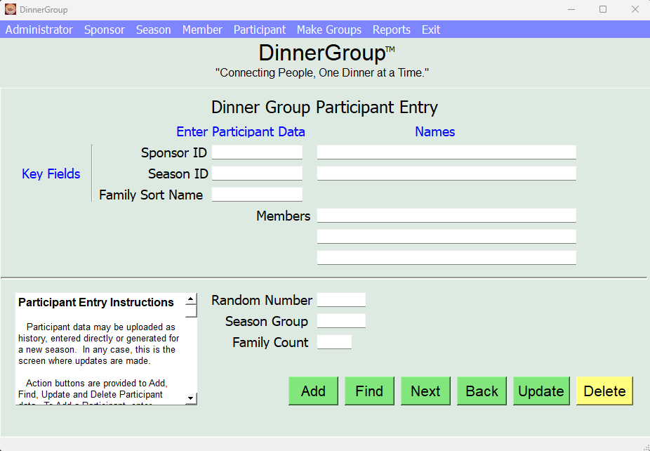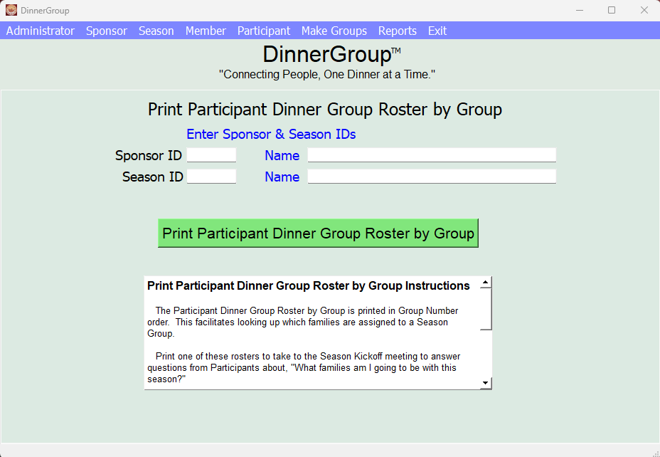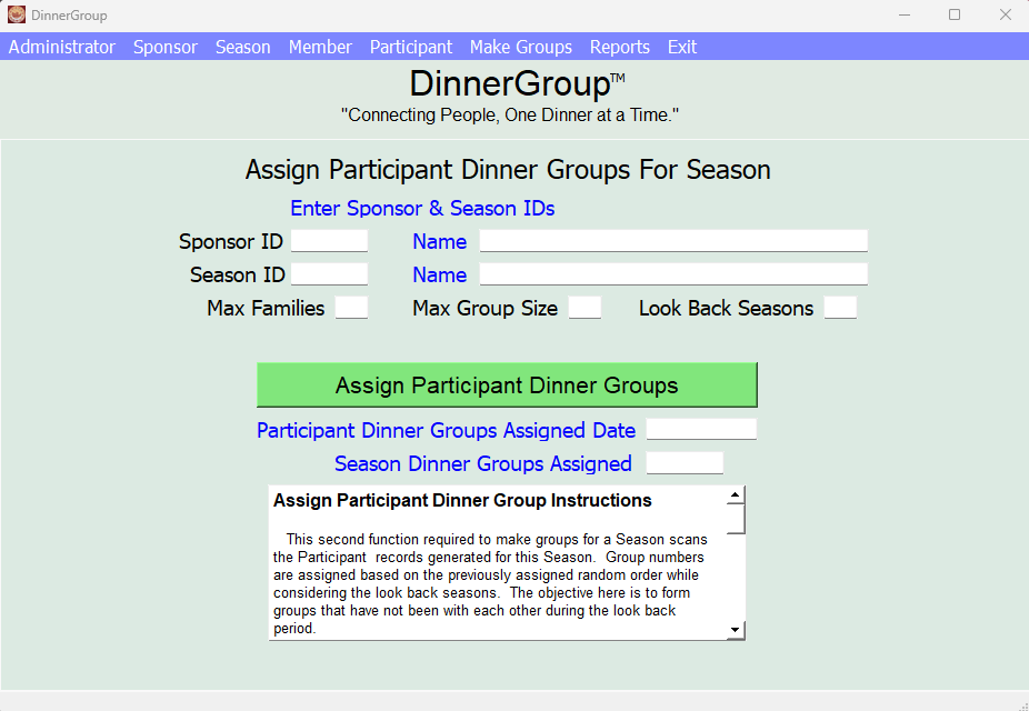 DinnerGroupᵗᵐ is a Windows application designed specifically for churches that use dinner groups to build community. Every feature focuses on simplifying administration so ministry leaders and volunteers can spend less time managing details and more time connecting people.