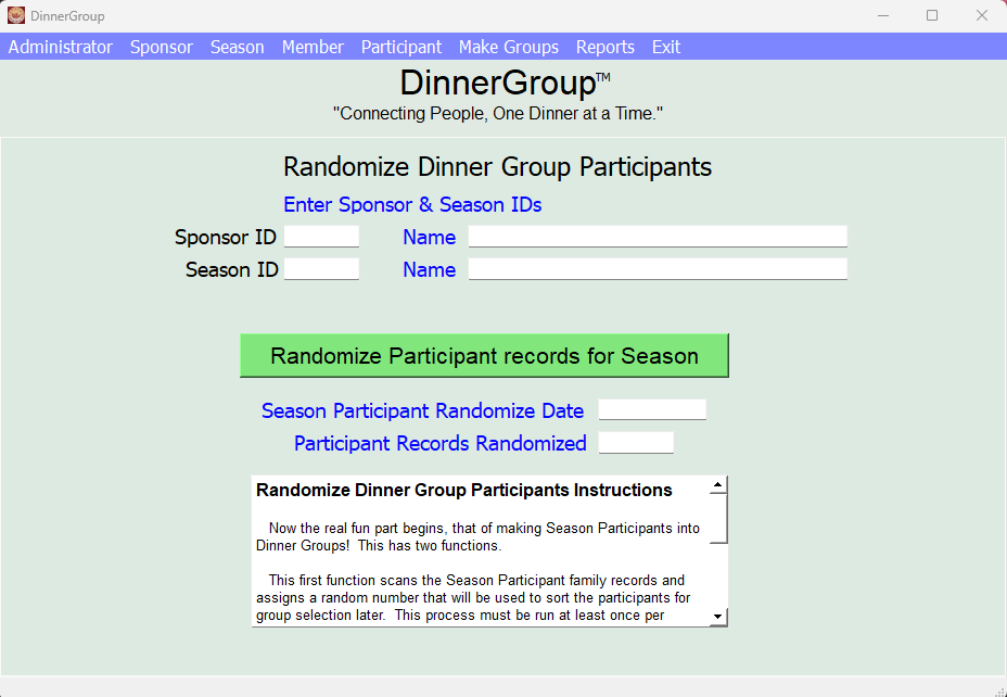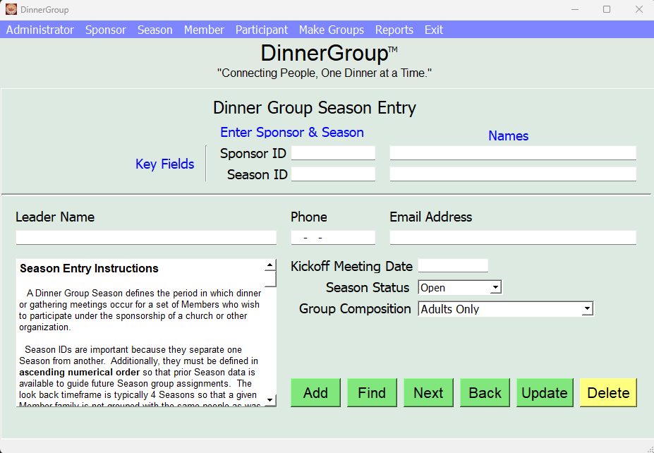 DinnerGroupᵗᵐ organizes everything around a Season. Each Season defines how your dinner groups will operate and provides the framework for participant assignment and reporting.