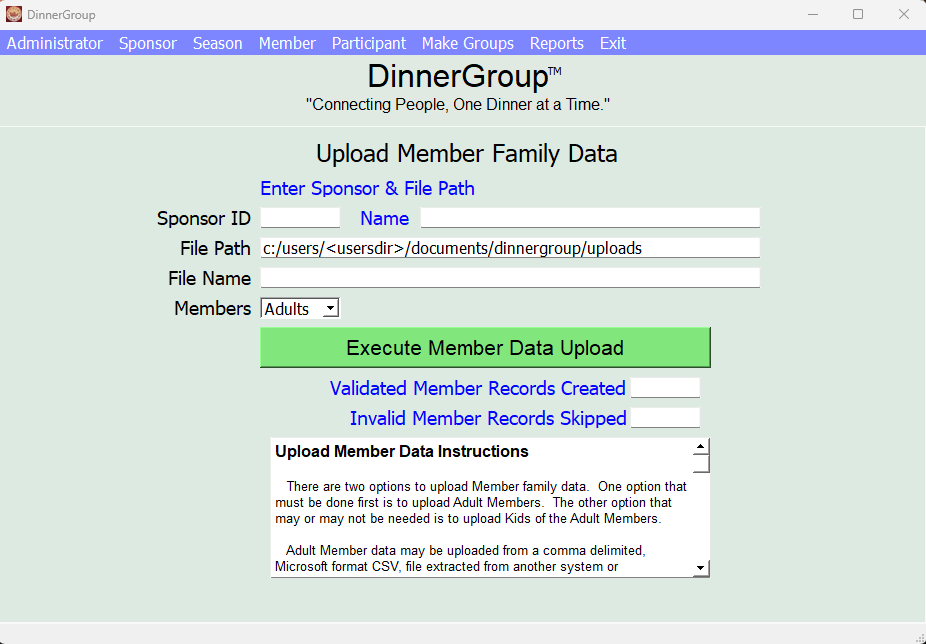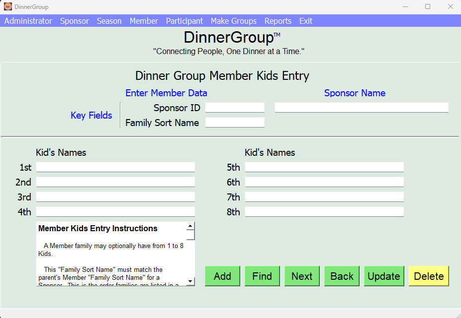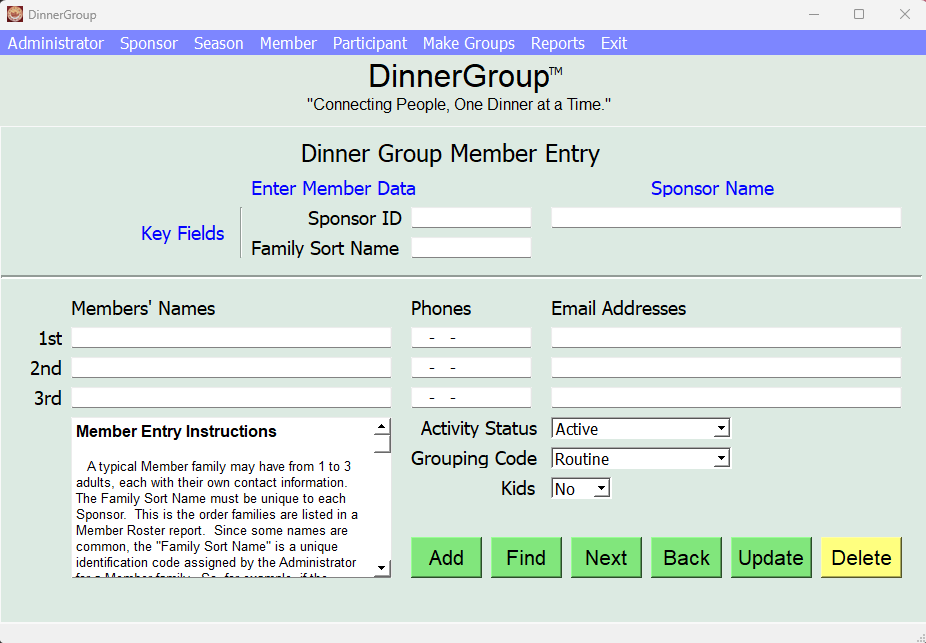 DinnerGroupᵗᵐ keeps member and family data organized and easy to maintain. Adults, youth, and children are tracked separately while preserving family relationships.