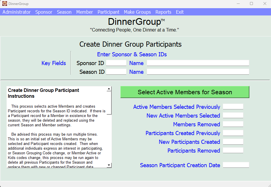 DinnerGroupᵗᵐ creates season Participants from Members with an active status.